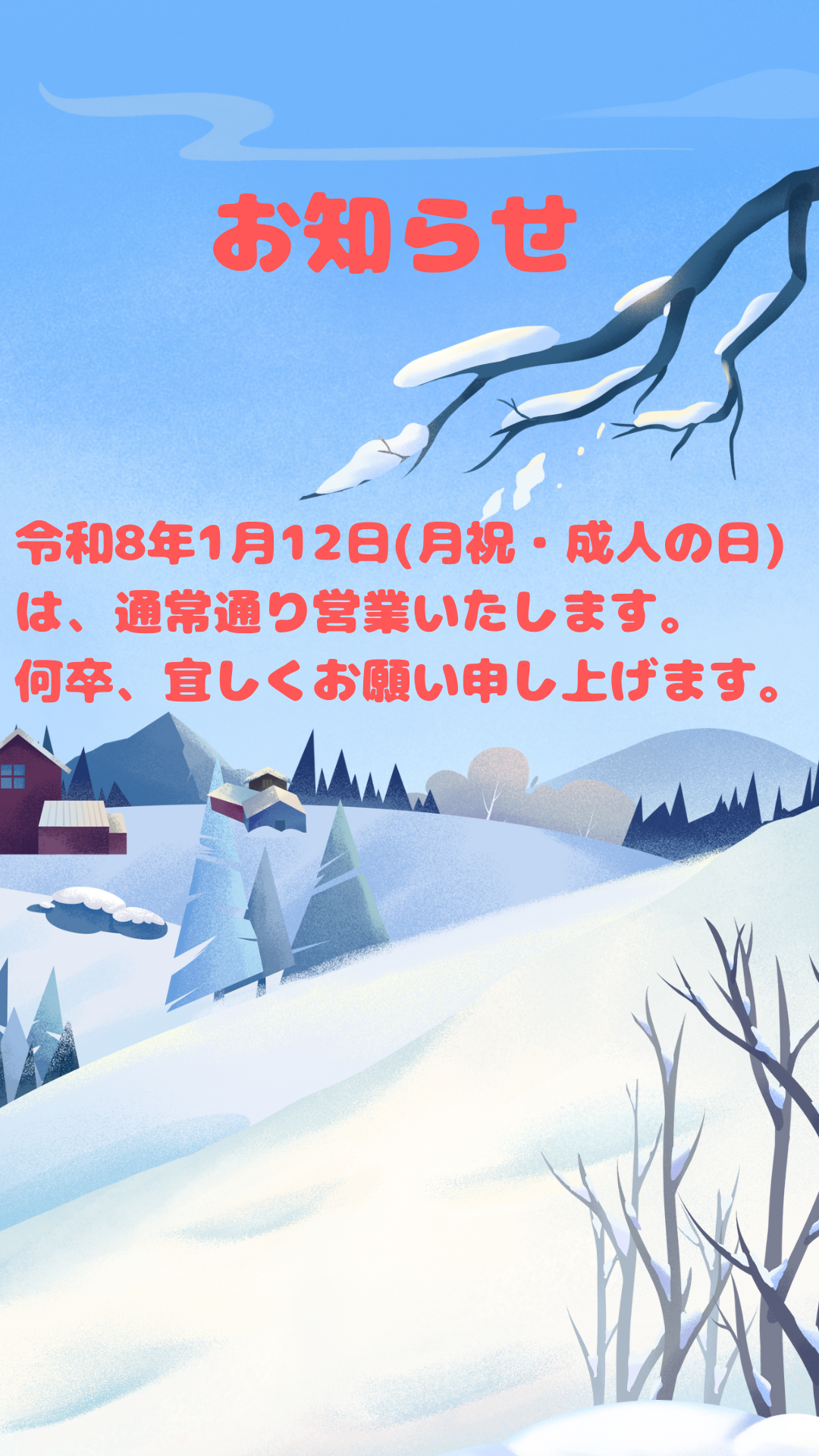 1月12日(月祝・成人の日)の営業について